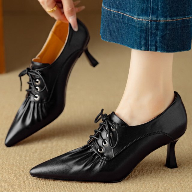 The upper is crafted from genuine sheepskin leather, giving a soft yet durable finish that molds beautifully to your feet over time. The inside and insole are lined with pigskin, ensuring breathability and all-day comfort. Designed with a lace-up closure and subtle pleated detail, these pumps offer a tailored fit and a refined touch that sets them apart from ordinary heels. With a pointed toe silhouette, they create a sophisticated, feminine look that never goes out of style.